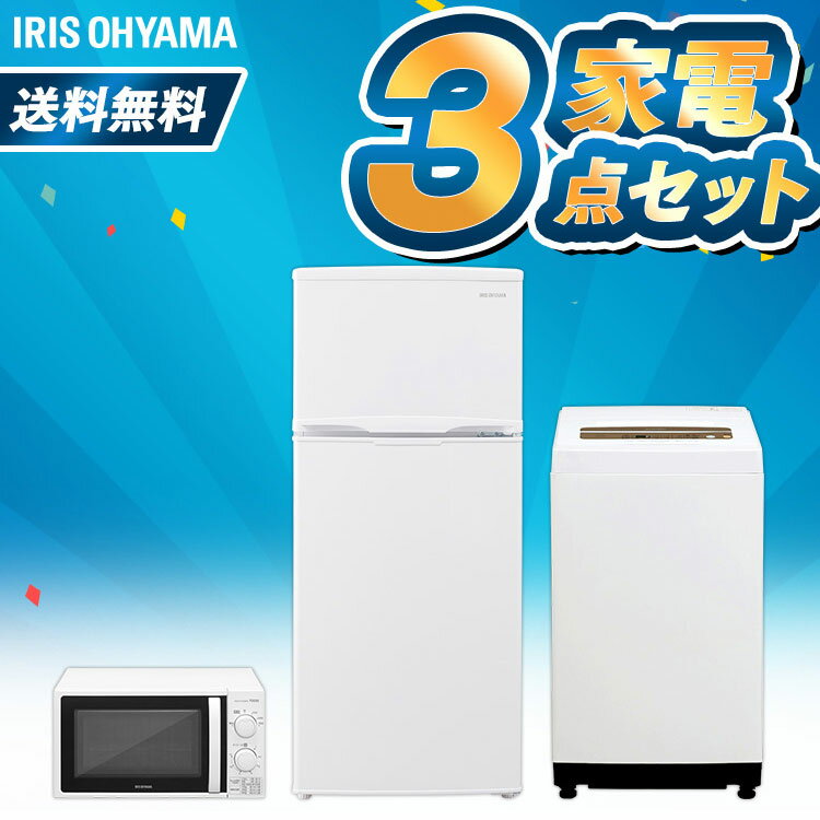 ■セット内容・ノンフロン冷蔵庫118L IRSD-12B-W・全自動洗濯機 5kg IAW-T503E・単機能レンジ ターンテーブル 17L IMG-T177【ノンフロン冷蔵庫118L IRSD-12B-W】●種類:ノンフロン冷凍冷蔵庫●冷却方式:直冷式●冷媒:R600a●ドア数:2●商品サイズ(cm):幅約48.0×奥行約52.5×高さ約116.0●質量:約30kg●定格電源:AC100V 50Hz/60Hz●定格消費電力電動機:49W/46W電熱装置:4W●定格内容積:118L(冷凍室:28L/冷蔵室:90L)●ドア開閉方向:右開き●電源コード長さ:約1.8m●トップテーブル耐荷重:30kgf●トップテーブル耐熱温度:100℃●付属品:製氷皿【縦型洗濯機 5.0kg IAW-T503E-W ホワイト】●種類:全自動電気洗濯機●定格電圧:AC100V●定格電源周波数:50/60Hz●定格消費電力:245/300W●標準洗濯容量:5.0kg●標準脱水容量:5.0kg●標準使用水量:120L●標準水量:46L●防水レベル:IPX4●外形寸法(cm):幅約55.5×奥行約52.5×高さ約92●質量:約31kg●付属品:給水ホース(約0.8m)【単機能レンジ ターンテーブル 17L IMG-T177】●商品サイズ(cm)外寸:幅約45.5×奥行約31.5×高さ約26.5(ハンドル、突出部を除く)加熱室有効寸法:幅約30.5×奥行約28.0×高さ約17.5●丸皿径:約24.5cm●庫内総容量※1:約17L●質量:約10.5kg●型番IMG-T177-5-W:周波数50Hz専用(東日本)IMG-T177-6-W:周波数60Hz専用(西日本)●電源:AC100V(50Hzまたは60Hz専用)●定格消費電力:1100W●定格高周波出力:700W、600W、500W、弱(300W)、解凍(200W)、煮込み(120W)●発振周波数:2450MHz●タイマー:15分●区分名※2:A●電子レンジ機能の年間消費電力量※3:50Hz:59.6kWh/年、60Hz:58.9kWh/年●年間待機時消費電力量※3:0.0kWh●年間消費電力量※3:50Hz:59.6kWh/年、60Hz:58.9kWh/年●電源コード:1.5m※1 庫内総容量とは、JISの判断基準にもとづき算出された容量です。