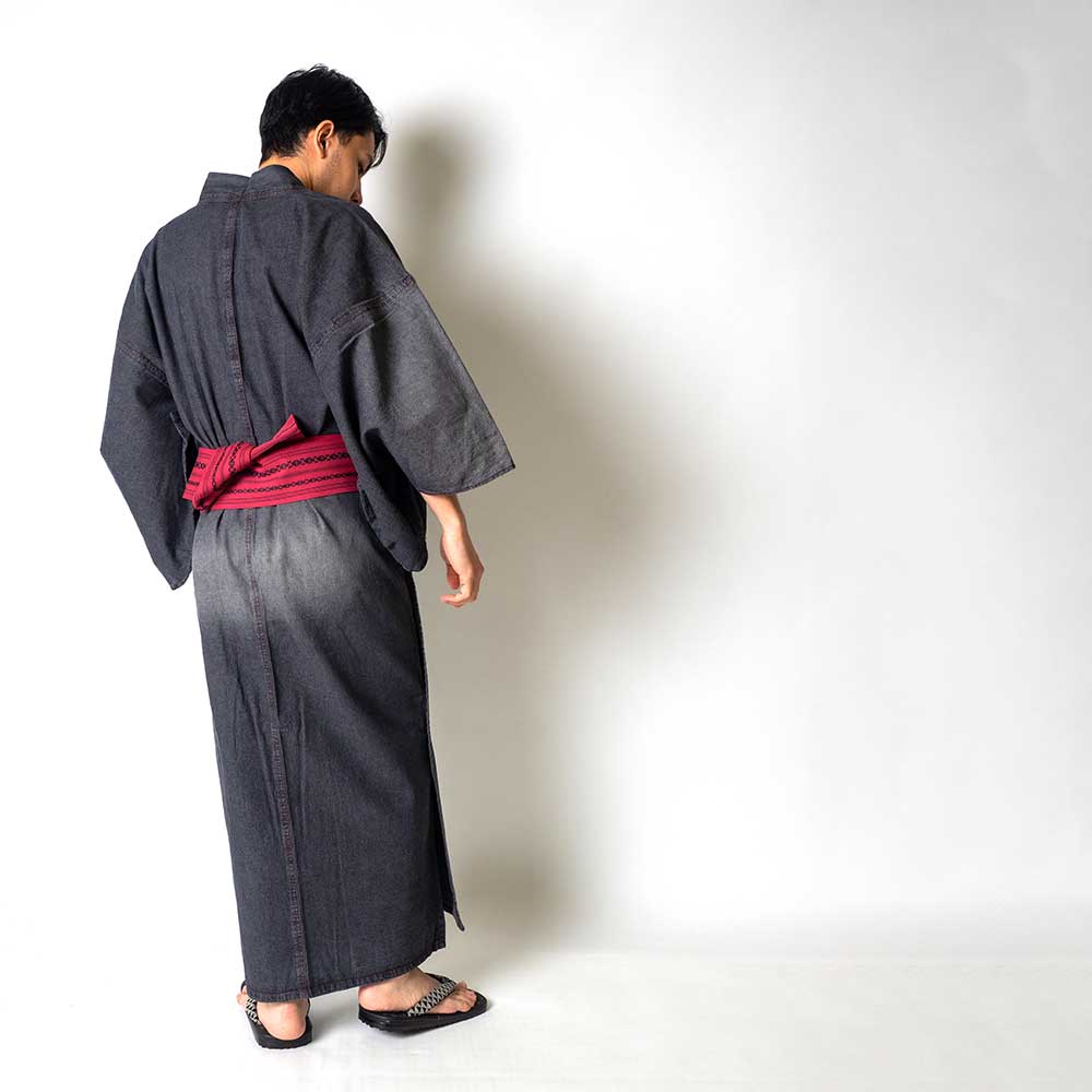 |送料無料|【着物+帯+下駄+腰紐】デニム着物浴衣メンズ・ブラック・ダメージ加工 男性用お仕立て上がり着物浴衣4点セット|メンズ|男ゆかた|着物|ブラック|黒||無地|